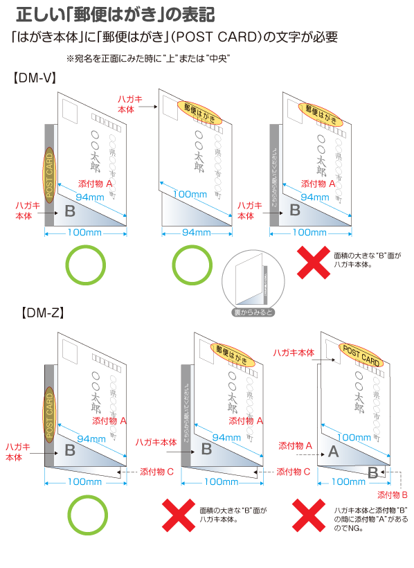 ここまではあくまで一例です。現在の所、実際には規定の運用は各郵便局・担当者によって個別に判断されており、ここでNGとされた例が郵便ハガキとして認められるケースもございます。お客さまで投函を予定している場合は、投函する郵便局で確認ください。