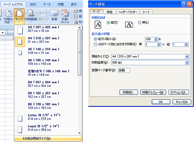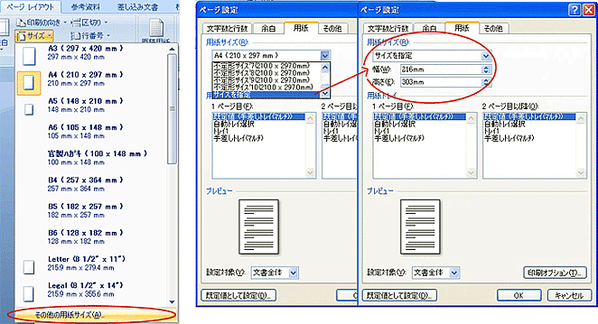 [ページレイアウト]にて[サイズ]のタブをご選択いただき、用紙サイズをプルダウンより、[そのほかの用紙サイズ]を選択し、