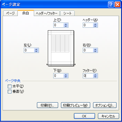 excelの場合は、「余白」は、上下左右それぞれ0mmに設定します。