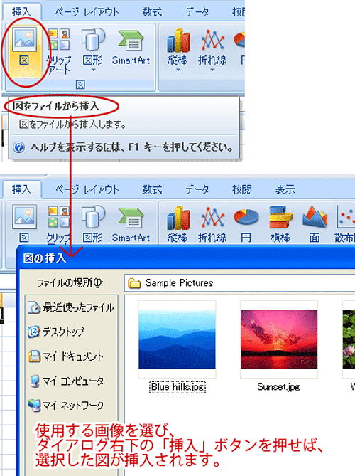 画像挿入の際には、下記の手順で[挿入]→[図]→[ファイル]をお選びください。