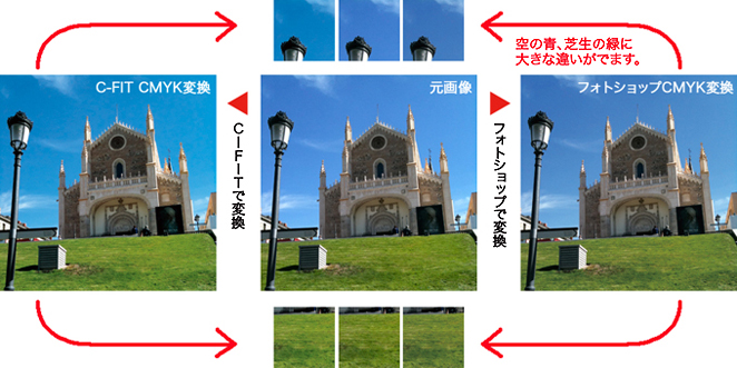 この変換前と変換後の色の差異をできるだけ小さくする方法として、 栄光では「C-FIT(富士フィルム)」というソフトを採用しております。