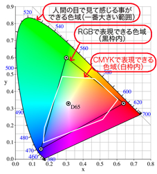 このRGB→CMYK変換は、フォトショップなどの画像処理ソフトでしていただくのですが、 RGBとCMYKでは色再現範囲が異なるため、画像によっては変換後大きく色調がかわることがあります。 (CMYKで表現できる色の範囲がRGBで表現できる色の範囲より小さいです。)<図1>