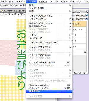 デザインが完成したら、入稿用のデータとして「レイヤーパレット」のオプションメニューから『画像を統合』を選択し、作業中に作成した全てのレイヤーは、一枚の背景レイヤーに統合します。