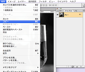 グレースケールモードに変換しました。チャンネルが[グレー]のみの1チャンネルになっていることが確認できます。