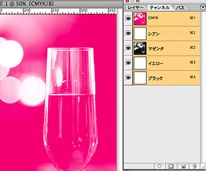 チャンネルで「CMYK」を選択。印刷したい仕上がりイメージに近い(M1色刷りならマゼンダ)色で表示されます。