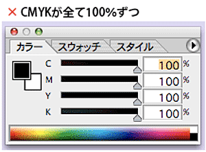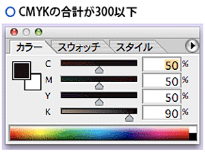 ※C・M・Y・Kの数値の合計が300%を超えるとインクが乾かず裏うつりなどのトラブルの原因となります。