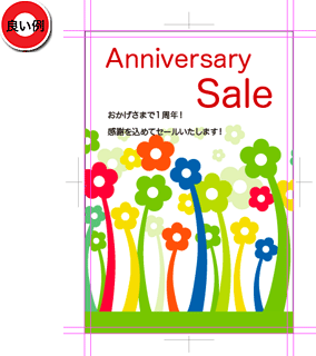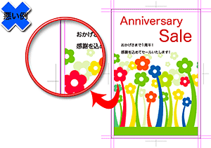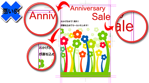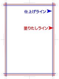 仕上がりラインからはみ出た部分は切れますので、切れて困るような文字や画像は、仕上がりラインより内側に配置します。