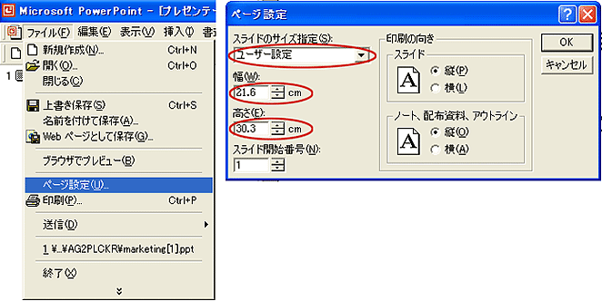 [ファイル]→[ページ設定]にてスライドのサイズ指定のプルダウンメニューより「ユーザー設定」をご選択の上、幅と高さに、[仕上がりのサイズと同じ] (A4のチラシを作るときは21cm×29.7cm)数値を入力して下さい。