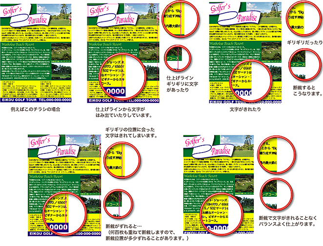 なお、ぬりたし有り無しにかかわらず、仕上がりラインに近いところへあるものは、断裁時の細微なズレによってもかけてしまう恐れがあります。